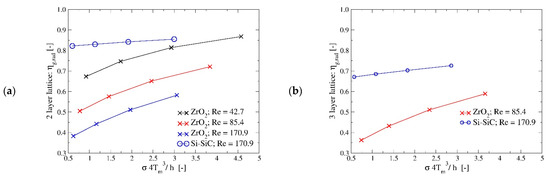 where is the surface area of the lattice in contact with the fluid. This efficiency takes into account the fact that, moving away from the base, the lattice temperature tends to reach the fluid temperature, which in turn decreases the heat transfer rate with respect to the ideal case. In this campaign two parameters were varied: the average velocity of the flow and the thermal conductivity of the solid material. Indeed, once the geometry is fixed, the heat transfer theory suggests that the fin efficiency dependents on the convective heat transfer coefficient and the thermal conductivity. Specifically, three values of thermal conductivity were investigated: 2 W/(m∙K), 6 W/(m∙K) and 46 W/(m∙K). The first value is representative of ZrO2 [32], the second value is representative of Al2O3 [32] while the last value is representative of Si-SiC [33] at high temperatures. The sub-set of the flow properties of the first simulations campaign, for which the Prandtl number is equal to 0.7, was employed in this second one.