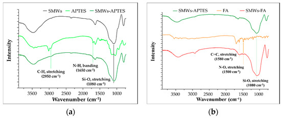 The SMWs synthesis and FA binding studies were analyzed using FT–IR. The SMWs showed a strong bond between silicon and oxygen at 1080 cm−1 (Figure 1a, black). As a result of the FT–IR measurement of SMWs-APTES, the C-H (2950 cm−1) and N-H (1650 cm−1) bonds, which are characteristic of APTES, were confirmed, and it was verified that APTES was bonded to the SMWs surface. As a result of comparing the FT–IR spectra of SMWs-FA (Figure 1b, red) and FA (Figure 1b, orange), the C=C bond (1580 cm−1) and N-O bond (1500 cm−1) of FA appear in SMWs-FA.