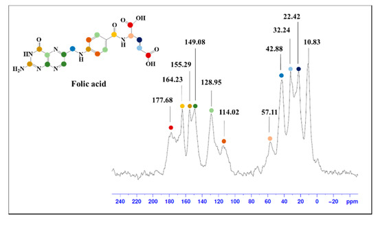 Solid-state (13C) nuclear magnetic resonance (ssNMR) spectrum of folic acid-conjugated SMWs. The peak in folic acid, which can be identified through ssNMR, is indicated by the same color in the molecular structure.