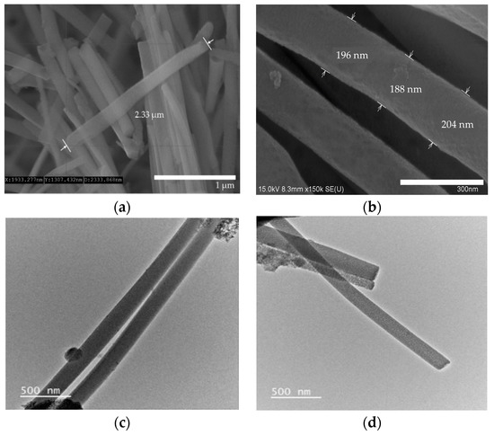Scanning electron microscopy (SEM) images (a,b) and transmission electron microscopy (TEM) images (c,d) of SMWs.