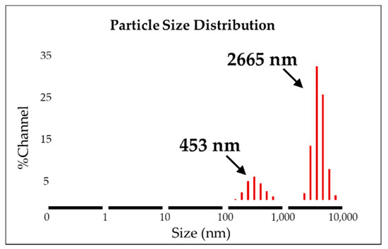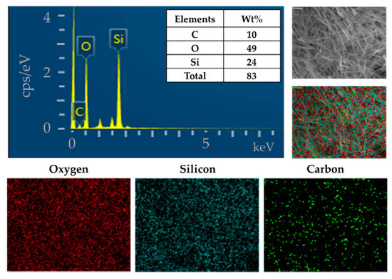 The AAO template was used to synthesize the uniform form of silica microwires in this study. The SMWs obtained by removing the template after synthesis were uniformly shaped, as shown in the SEM results depicted in Figure 3a. The SMWs were about 2.33 μm in length and about 200 nm in diameter, as shown in the image of Figure 3a,b. In addition, the analysis using TEM (Figure 3c,d) showed that SMWs were synthesized in wire form and that the distribution of even silicon dioxides was generally confirmed. To confirm the element distribution of SMWs, element mass ratio and mapping analysis were performed using the energy dispersive spectrum (EDS). The elemental distribution of SMWs was confirmed to be mainly composed of 49% oxygen and 24% silicon, and 10% carbon was detected in the fixation reagent used to fix the sample (Figure 4). In Figure 5, DLS results of SMWs dispersed in distilled water confirmed that they have two (453 and 2665 nm) hydrodynamic sizes, which verifies that the synthesized SMWs exist in the form of wires in the dispersion.