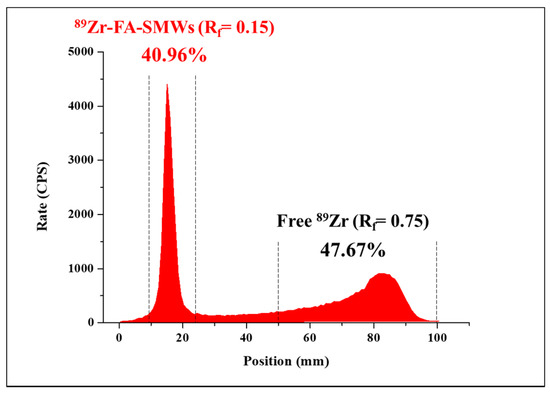 In this reaction, when labeling 89Zr, a method of directly coordinating 89Zr to hydroxyl groups (-OH) on the silica surface without a chelator was used. This method is possible because Zr is an oxygen-affinity metal [31]. After the 89Zr labeling reaction, the labeling yield of 89Zr-SMWs was evaluated using a radio-TLC scanner. As shown in Figure 6, the labeling yield of 89Zr-SMWs was 40.96% (Rf = 0.15). This is low when compared with the labeling method using a chelator. However, in this study, to prevent the introduction of compounds other than FA on the surface of our drug carrier, the chelator-free labeling method was chosen, and sufficient efficiency was achieved for the biological evaluation to proceed.
