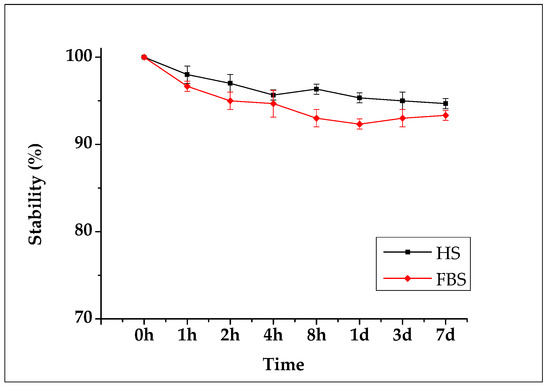 For seven days after the 89Zr-SMWs were labeled, the in vitro stability was evaluated for HS and FBS, and measurements were made using a gamma counter. As shown in Figure 7, the 89Zr-SMWs showed a high stability of more than 95% for 7 days in human serum. This means that 89Zr was firmly positioned in the silanol group on the surface of SMWs, and is thus expected to be suitable for in vivo behavior studies of drug carriers using 89Zr-SMWs. The stability test conducted on FBS showed lower values than HS, but still showed around 95% stability over 7 days, demonstrating meaningful in vitro stability.