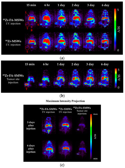 Positron emission tomography (PET) images of CT-26-bearing female Balb/c mice (5 weeks). Mice were scanned using a 5 min static mode at time points after (a) intravenous injection of 89Zr-FA-SMWs and 89Zr-SMWs, (b) tumor site injection of 89Zr-FA-SMWs and (c) maximum intensity projection (MIP) images.