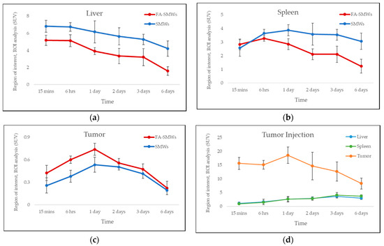 PET was carried out to evaluate the in vivo behavior and drug delivery effects of our drug carrier. To compare the tumor affinity of FA in 89Zr-FA-SMWs, 89Zr-SMWs were evaluated via the same process, and 89Zr-SMWs were also injected into the tumor site to analyze the in vivo behavior of 89Zr-SMWs located on the tumor. As shown in Figure 9a, 15 min after the tail vein injection, SMWs showed a high accumulation in the liver and spleen, regardless of the presence of FA. They accumulated in the tumor site from 6 h and the highest accumulation was observed after 3 days. The 89Zr-FA-SMWs, conjugated with FA, showed a high accumulation in the tumor site compared to 89Zr-SMWs and were confirmed to last longer. As can be clearly seen from the maximum intensity projection (MIP) image (Figure 9c), FA is positively involved in the tumor accumulation of drug carriers and the persistence of diagnostic signals. High accumulation in the liver and spleen is typically accumulated by reticuloendothelial system (RES) and unfortunately [8], it was observed to last for 6 days. This suggests that the surface improvement in 89Zr-FA-SMWs by means of biocompatibility polymers is necessary to improve drug delivery effects. 89Zr is reported to show a high bone affinity [33], and signals from bones and joints observed 2 days later were 89Zr-deviated from the drug carrier. In the case of 89Zr-FA-SMWs injected on the tumor site (Figure 9b), they were not only able to accumulate in the tumor, but also in the liver and spleen sequentially as they circulated through the blood, and depending on time, it was observed that the accumulation amount in the tumor decreased, and signals increased in the liver and spleen. Region of interest (ROI) results from quantitative analysis of signal intensities of tumor and major organs support PET studies. In Figure 10a,b, 89Zr-FA-SMWs showed a lower accumulation in the liver and spleen, particularly in the spleen, and that the accumulation increases for about a day after injection. However, in the tumor, it was confirmed that FA-SMWs accumulated more in the tumor from the initial time (Figure 10c). As a result of the tumor site injection in Figure 10d, it was visibly released out of the tumor from 1 day after injection, and it was quantitatively confirmed that the accumulation in the liver and spleen continued to increase. This shows that drug carriers designed to exhibit less affinity with tumors are disadvantageous for long-term blood circulation and can create difficulties in effective drug delivery, eventually causing clearance by RES even after reaching the tumor.