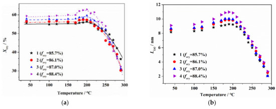 Crystalline structure for PAN fibers after heat treatment at different temperatures lasting for 10 min: (a) crystallinity and (b) crystallite size.