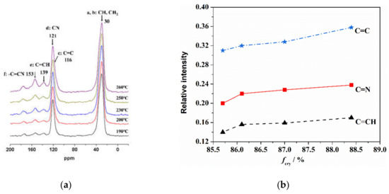 Solid state 13C-NMR was used to characterize the existing state of the carbon atoms in the skeleton chain of the PAN fiber during the thermal stabilization reaction. The influence of the orientation structure of the PAN fiber on the thermal stabilization reaction was analyzed and is shown in Figure 2. As seen in Figure 2a, CH and CH2 (at 30 ppm) were the intrinsic carbon atom structures of the PAN molecular chain, and –C≡N (at 121 ppm) was the carbon atom structure of the cyano group on the side of the PAN molecular chain. After the dehydrogenation, the intrinsic carbon atom structures mainly changed to C=C (at 116 ppm) without hydrogen and C=CH (at 139 ppm) with only one hydrogen. In addition, after the cyclization of side nitriles, the intrinsic carbon atom structures of -C≡N changed to C=N (at 153 ppm). With the increase in the heat treatment temperature, the cyclization and dehydrogenation reactions gradually progressed, and the characteristic peaks of the C=C, C=CH and C=N structures gradually increased.