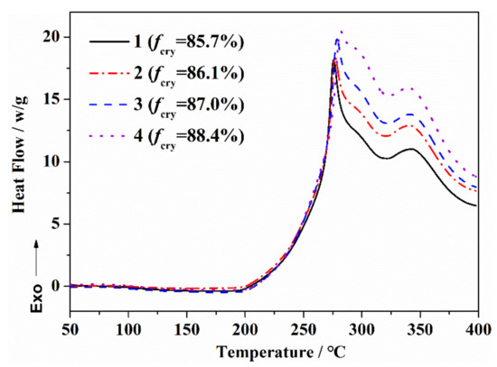 The exothermic behavior of the PAN precursor fiber with different orientation structures during the thermal stabilization process was measured by differential scanning calorimetry (DSC, TA instrument Q100 (New Castle, DE, USA)). The thermal treatment process was carried out at a heating rate of 10 °C/min, from 50 to 400 °C in air atmosphere.