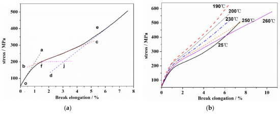 The structure evolution of the PAN fiber during thermal stabilization had an obvious effect on the mechanical properties. The stress–strain curves of PAN fiber were shown in Figure 5. As seen in Figure 5a, the stress–strain curve of the PAN precursor had the typical structural characteristics of a linear polymer chain. At the initial stretching stage, the stress increase was in proportion to the increase in elongation. The slope of the oa segment (Figure 5a) was used to obtain the tensile modulus, E, which reflected the general elastic deformation ability caused by the bond length and the bond angle in the linear molecular chain under the external force. With the further increase in elongation, the PAN molecular segments were forced to move until the yield point, f, resulting in the high elastic deformation stage (bc segment). After that, with the increase in stress, the molecular chains began to slip, which showed obvious strain hardening phenomenon (de-segment). Subsequently, the stress continues to increase, and the molecular chains in some stress concentration areas gradually break, resulting in the overall fracturing of the sample. Figure 5b showed the stress–strain curves of the PAN fiber at different thermal stabilization stages. In addition, several typical mechanical characteristic parameters are shown in Table 3. As can be seen, with the increase in the heat-treated temperature, the yield strength and tensile modulus of the PAN fiber first increased, and then decreased rapidly when the temperature exceeded 200 °C. In comparison, the elongation at break decreased to the lowest value at 200 °C, after which an increased was observed. In addition, it can be observed that with the increase in temperature, the high elastic behavior gradually decreased until its complete disappearance at 200 °C.