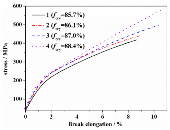 The above discussion shows that the yield strength and initial modulus of the fibers with a higher orientation degree increased due to the formation of more aromatic rings after thermal stabilization. In addition, the elongation at break of the fibers with a higher orientation degree was also relatively larger after thermal stabilization. This was because the thermally stabilized fibers with an initial higher orientation degree had more aromatic structures, a larger aromatic ring area and better structural regularity. This led to a better axial ductility of the PAN fiber under external force.