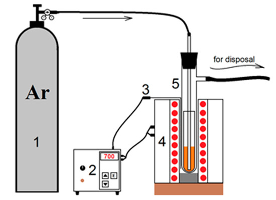 Yttrium oxysulfate was obtained by decomposition of yttrium sulfate Y2(SO4)3 (99.99%, Novosibirsk Rare Metals Plant, Novosibirsk, Russia) in an argon atmosphere at a temperature of 700 °C. A schematic of an installation for carrying out high temperature decomposition processes is shown in Figure 1. Argon of high purity 99.9999% was used to create an inert atmosphere. Temperature control and regulation was carried out using a microprocessor controller (“Thermokeramika”, Moscow, Russia). Temperature in the reaction zone was measured with a chromel-alumel thermocouple. A weighed portion of dry Y2(SO4)3 was placed in a quartz reactor and purged with argon for 30 min at a rate of 6 L/h. After that, the reactor was placed in a heated vertical furnace and held for 10 h. After the completion of the reduction process, the reactor was removed from the furnace and cooled to room temperature. The decomposition recovery process is described by the equation: