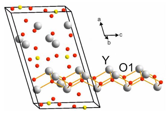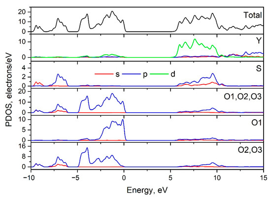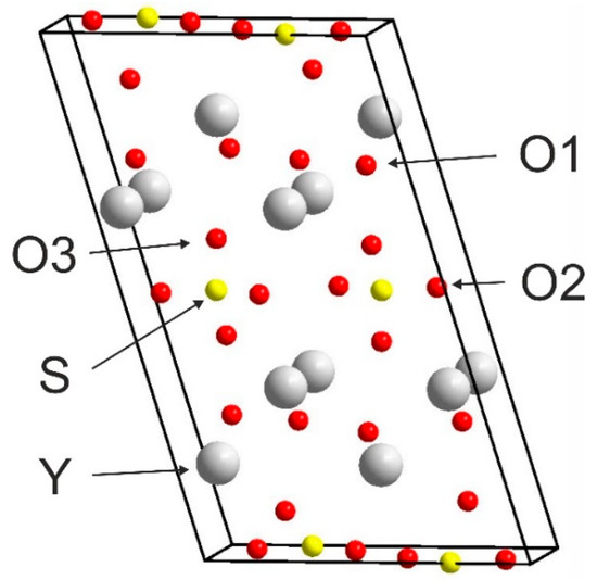 Figure 2 presents the crystal structure of Y2O2SO4. Investigated sulfate presents a monoclinic structure with the C2/c space group (#15). As can be seen from Figure 2, the crystal structure consists of SO4 layers and layers formed with Y and O ions. Calculated values of lattice parameters and atomic coordinates are presented in Table 1 and compared with experimental data from ICDD PDF 53-0168.