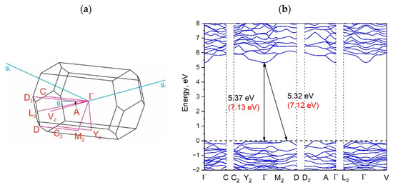 Brillouin zone (a) and electronic band structure (b) of Y2O2SO4. Band gap values obtained with the hybrid functional are shown in parentheses in (b).
