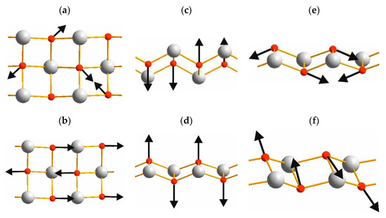 Representative atomic vibrations of [Y2O22+] chains in Y2O2SO4: (a) Bg 533.1 cm−1, (b) Ag 505.3 cm−1, (c) Bg 383.2 cm−1, (d) Ag 352.5 cm−1, (e) Au 546.7 cm−1, (f) Bu 499.1 cm–1.