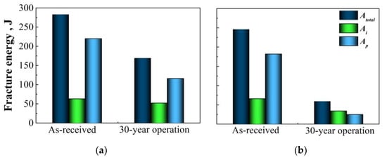 Based on the revealed effect, the total fracture energy determined during the Charpy testing was separated into the components of the crack initiation energy Ai and the crack propagation energy Ap using instrumentalization of the testing facility. It was established for the case of X52 steel operated for 30 years (Figure 1) that almost the whole effect of operational decrease in impact toughness is due to the component Ap. The effect is especially considerable under low-temperature test conditions (Figure 1b). This means that as in the case of fracture toughness (J-integral), the indicator of the resistance to crack propagation is especially sensitive to steel state and, therefore, more suitable for the assessment of steel degradation.