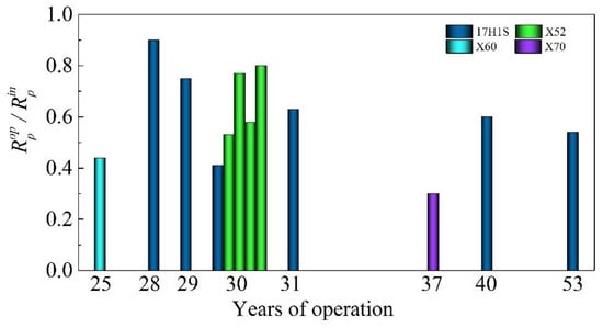 The changes in polarization resistance for 17H1S, X52, X60, and X70 pipe steels as a result of long-term operation Ropp relative to the corresponding values in the as-received state Rinp.
