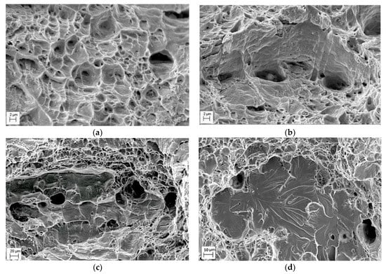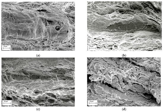 Analysing the fracture surface of specimens after impact toughness testing, certain fractographic features of steel degradation can be also distinguished [25]. Thus, in contrast to the as-received X70 steel specimen showing ductile fracture only (Figure 5a), some brittle fragments on the ductile fracture surface of the operated X70 steel specimens were found (Figure 5b). Delaminations of various lengths with pores in their depth were observed on the fracture surface of the operated X70 and 17H1S steel specimens (Figure 5b,c). Bridges between the delaminations were fractured by the dimple mechanism, which is typical for unoperated steels. Furthermore, some rounded fragments of cleavage (Figure 5d) were observed on the fracture surface of the 17H1S steel operated for 51 years, which was characterised by the highest degradation degree among the studied steels based on the assessment of operational decrease in impact toughness (Table 1). Therefore, delaminations and transgranular cleavage areas (Figure 5b–d) were considered as the features of in-service degradation of the pipeline steels. The development of delaminations (Figure 5b,c) and cleavage nucleation (Figure 5d) in operated steels was associated with hydrogen influence on steel degradation during long-term operation. The observed features are in a good agreement with other studies [9,19] where similar fractographic signs of embrittlement were detected for pipeline steels after operation or hydrogenation.