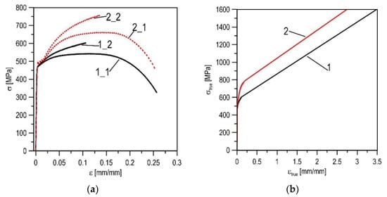 The stress–strain graphs of the X52 steel in as-received state (1) and after 30 years of service (2): (a)—the nominal curves (1_1, 2_1) and true curves for section of uniform tension (1_2, 2_2); (b) —the full true stress–strain dependences.