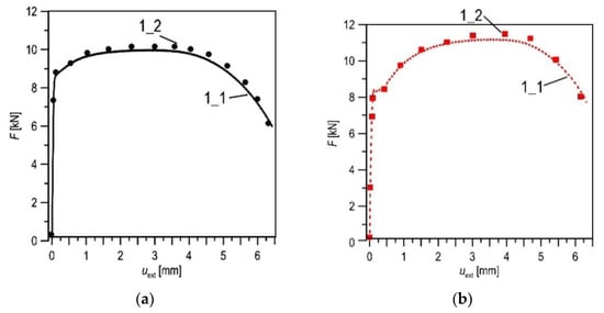 The comparison of the experimental (1_1) and numerical (1_2) force-elongation data for the X52 steel in the as-received state (a) and after 30 years of service (b).