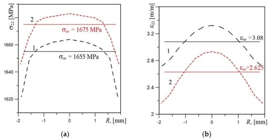 The stress (a) and strain (b) distributions obtained by numerical calculation (uniaxial tensile test specimen) for the X52 steel in the as-received state (1) and after 30 years of service (2), where σ22—stress in the tensile direction, ε22—strain in the tensile direction, σav—the mean value of stress σ22, εav—the mean value of strain ε22, R—the distance from specimen axis.