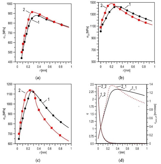 The distributions of stress components (a–c) of strain epl_eff and coefficient of triaxiality stress η (d) at load at Du = 1.2 mm: (a–c)—for the X52 steel in the as-received state, denoted as 1; and after 30 years of service, 2; (d)—for η (1_1), (2_1) and for epl_eff (1_2), (2_2), where σ11—stress in direction of crack growth, σ22—stress in the direction perpendicular to the crack plane, σ33—stress in the direction of the specimen thickness, r—distance from the crack tip.