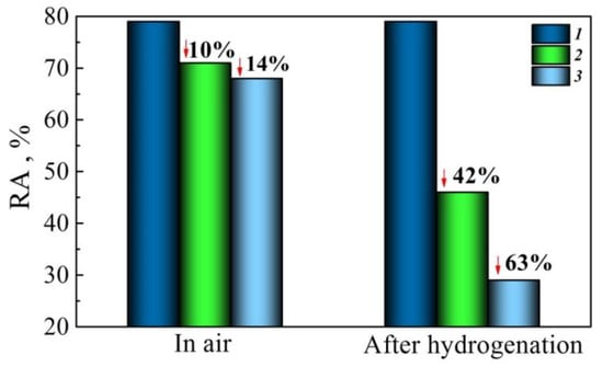 Another possibility exists of enhancing the sensitivity of certain parameters under the operational degradation assessment [38]. For instance, standard plasticity parameters are not sensitive enough; however, this drawback can be eliminated by preliminary hydrogenation of the test specimens. The presence of hydrogen as the factor of embrittlement should highlight the differences between different steel states since it is expected that the plasticity of degraded metal drops sharply under hydrogen action. In particular, the operation of the 17H1S pipe steel led to susceptibility to hydrogen embrittlement after its preliminary hydrogen charging, even for unloaded metal, and was more intensive for longer-operated steel (Figure 10). It can be noted that steel plasticity decreased as a result of operation by 14% if measured in air, whereas the effect rose to 63% after steel hydrogenation.