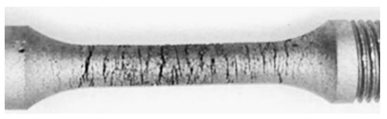 Thus, the hydrogenation of the specimens just before tensile tests in air leads to an enhancement of the susceptibility of the reduction in area to steel degradation by more than four times. Such an approach is suitable for increasing the sensitivity of the plasticity parameter to steel degradation regardless of the steel’s operating conditions (with or without environmental action). Preliminary hydrogenation of the metal simply makes it possible for the difference in the material state to manifest more clearly. However, it should be taken into account that hydrogen intensifies the surface cracking of the specimen as a result of its loading (as illustrated in Figure 11), and this contributes to overall elongation. Thus, this is the reduction in the area that is suitable for assessing steel plasticity, similar as in the case described above for nonhydrogenated specimens.
