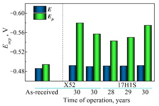 Open-circuit potentials Eocp of the polished surface E and the fracture surface Efr of the steel specimens made of the as-received and postoperated X52 and 17H1S steels (measured in 0.3% NaCl solution).
