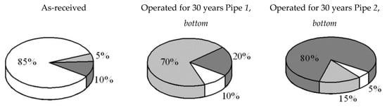 Considering the effect of corrosive environments on the reduction of serviceability of operated steels, it should be taken into account that degraded metal in general is more susceptible to such influences than as-received metal. This means that resistance to corrosion, SCC, and corrosion fatigue of degraded material is significantly lower than in the as-received state [11,12,16]. However, the other aspect of the problem is concerned with the influence of corrosive environments on the degradation of steel properties in the bulk of the material. Such an influence is possible in the case of the hydrogenating capability of working environments; the operational degradation of steels is then a result of the mutual effect of mechanical stresses and the hydrogen absorbed by metal. In general, a pipe wall could be hydrogenated from both external (due to breakdown of insulating coating) and internal surfaces. In the latter case, the reason is derived from the hydrogenating capability of transported hydrocarbons, particularly due to the presence of water and harmful admixtures. Thus, in this case, the essential part of the pipe wall could be hydrogenated as a result of electrochemical interaction of water condensed at the pipe internal surface with metal [16].