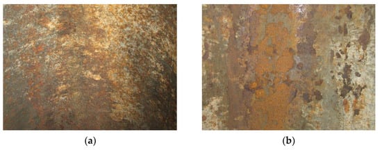 Corrosion defects at the inner surface of the pipeline made of the X52 steel: (a) top, (b) bottom. Scale 1:2.