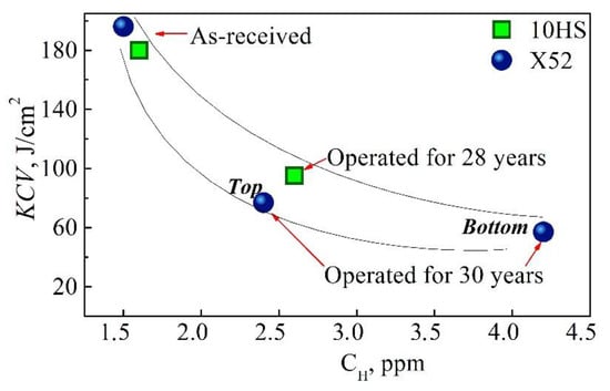 Concentration of hydrogen CH measured by extraction method vs. impact toughness KCV for the 10HS and X52 pipe steels.
