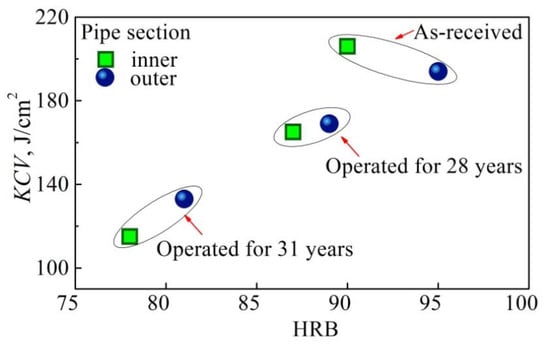 The special role of transported media as a source of hydrogenation of the pipe wall and, as a consequence, a factor in the intensification of steel degradation is also illustrated in Figure 16. It can be seen that KCV values are slightly lower if Charpy specimens were cut in the vicinity of the inner surface of the operated pipe, whereas a similar influence of the location of specimen cutting on impact toughness values was not observed for unexploited steel. The metal in the as-received state instead exhibited the opposite tendency (slightly higher impact toughness near the inner surface of the pipe). A noticeable decrease of both hardness and impact toughness observed in the operated steel close to the pipe inner surface is proof of more intensive degradation of this part of the pipe.