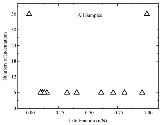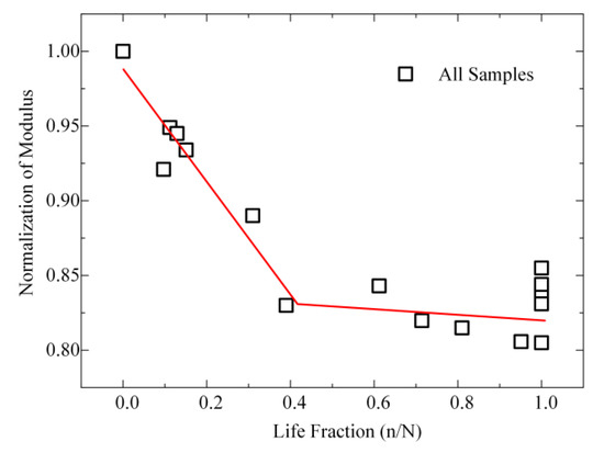 The development of fatigue damage in bones is commonly characterized by a reduction in the elastic modulus [6,10,11]. Most studies investigated the reduced modulus of bones in nanoindentation test [27,29,53]. In this study, the value (average ± standard deviation) of the reduced modulus was used in all of the results (Table 1). The reduced modulus of each specimen was normalized, and the initial modulus was set as 1. Fatigue life was used as the life fraction. Figure 4 displays all samples’ results (normalization). The two phases of the reduced modulus are linear with respect to r2 = 0.89:
