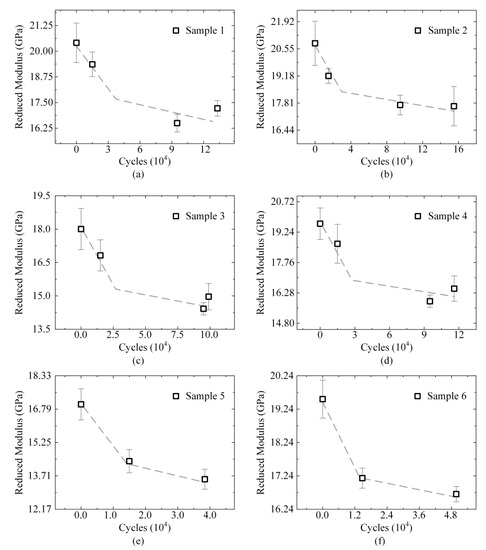 Evolutions of the reduced modulus in the adjacent region of each sample under four-point loading. (a–d) Reduced modulus of the samples subjected to four times of indentation tests; (e,f) Reduced modulus of the samples subjected to three times of indentation tests.