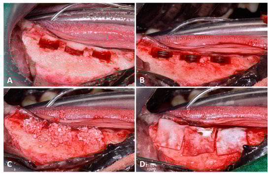 Surgical procedures used to place surface-treated implants in beagle mandibles. (A) Creation of buccal cubic defects, (B) Implant placement, (C) Distribution of bone graft material, (D) Collagen membrane placement.