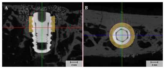 The µCT images of regions of interest (ROIs) which included 1 mm around each implant. (A) buccal view, (B) occlusal view.