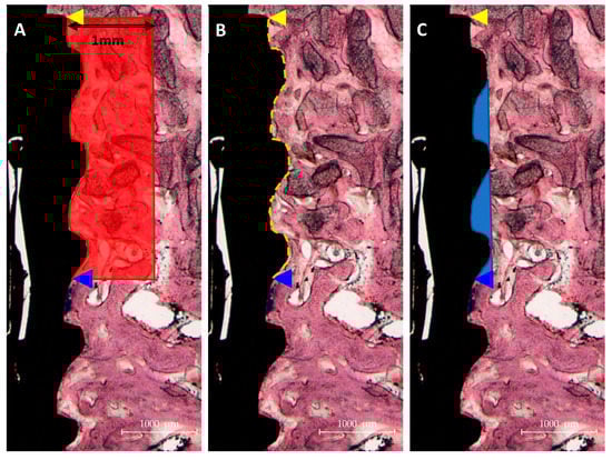 Histometric measurements in regions of interest (ROIs). ROIs were fixed from implant platforms to the third thread and at 1 mm around implants in occlusal view. (A) NBA: New bone area, (B) BIC: Bone-to-implant contact, (C) ITBD: Inter-thread bone density.