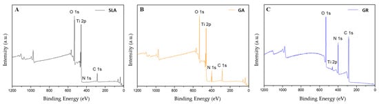 Surface XPS spectra of the three study groups. (A) The SLA group, (B) the GA group, and (C) the GR group.