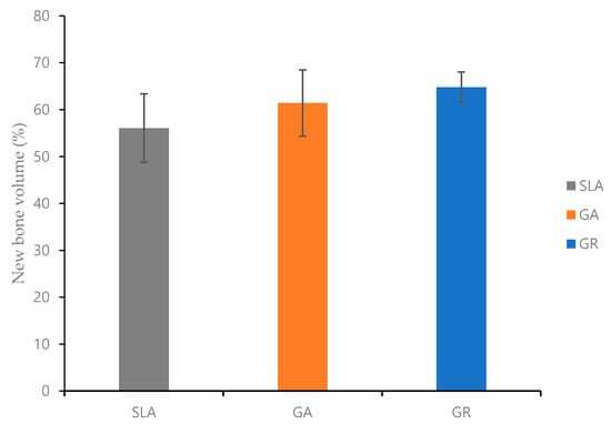 Histometric results are summarized in Table 2 and Figure 8. NBA values of the SLA, GA, and GR groups were 38.27 ± 9.34%, 52.37 ± 7.93%, and 43.77 ± 8.81%, respectively, and were significantly higher in the GR group than in the SLA group (p < 0.05).