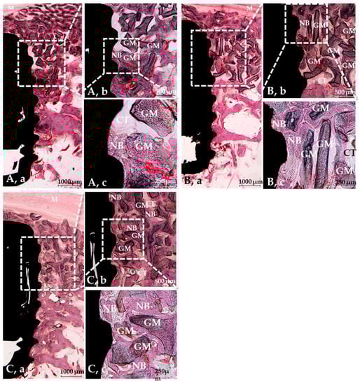 H&E stained sections at 8 weeks post-implantation. (A) The SLA group, (B) the GA group, (C) the GR group, (a) ×12.5, (b) ×40, (c) ×100. Note: NB = New bone, GM = Bone graft material, CT = Connective tissue, M = Membrane.
