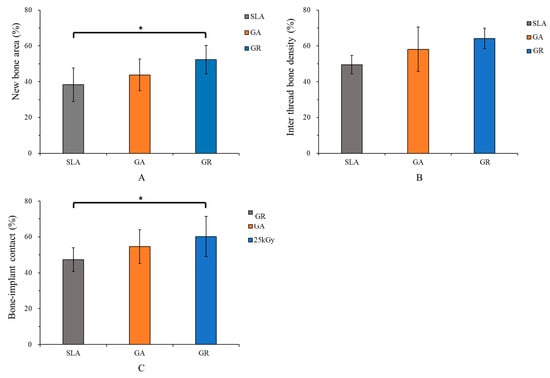 Histometric analysis within regions of interest (ROI). (A) New bone area (%), (B) Inter thread bone density (%), (C) Bone-implant contact (%). * Indicates statistical significance (p < 0.05).
