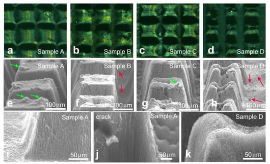 We first analyzed the effect of laser power on the array structure. Four samples with similar columnar patterns were engraved with the 15, 22, 30, and 38 W laser beams (denoted as Samples A, B, C, and D, respectively). The optical images showed that all arrays were burned down to the substrates (Figure 1a–d). The increase in laser power enhanced the deviation in the columns from parallelepipeds and changed their top surface. In particular, the tops of the columns of Sample A were flat (Figure 1e). Samples B and C had small holes in the column centers (Figure 1f,g). The columns in Sample D had deep craters with ragged edges (Figure 1h). There were round-shaped carbonaceous material contaminations (shown by green and red arrows in Figure 1e,f,g,h) presented on vertexes of Sample A columns, whereas for Samples B, C, and D, they were found mainly on the silicon substrates. The side surface of columns in Sample A contained shortened nanotubes, whose initial length before engraving was an array height of ~300 μm (Figure 1i). The nanotubes were generally aligned perpendicular to the substrate. The image taken from a crack of one of the columns showed a good ordering of the interior MWCNTs (Figure 1j), the same as the initial array (see Ref. [4]). Moreover, there was a poorly structured surface layer of ~5–10 μm in width. This meant that the interior regions of arrays were unaffected by the 15 W beam. Burning holes in the column centers under processing with higher laser power suggested that even the internal MWCNTs, which were not directly exposed to the beam, were modified during the engraving. Moreover, the morphology of Sample D surface layer changed. Nanotubes were entangled with each other, forming a cotton layer instead of an aligned structure (Figure 1k). The dark nanoparticles distributed on the surface were probably de-encapsulated catalyst nanoparticles.
