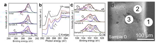 According to XPS data, the engraved samples obtained at the lowest and highest laser power (Samples A and D, respectively) contained about 14 at % of oxygen and about 4 at % of iron. The emergence of iron occurs due to the transport of encapsulated catalyst nanoparticles from the cavities of nanotubes under high-energy exposure. A similar effect was previously obtained for plasma-treated MWCNTs [45], single-walled CNTs filled with sulfur [46], and MWCNTs under femtosecond laser radiation [18]. The XPS C1s spectra are also governed by sp2-hybridized carbons (peak C1) with the FWHM of ca. 0.9 eV (Figure 2a), indicating a rather high quality of MWCNTs. The NEXAFS data confirm this. The π* resonance at 285.4 eV of Samples A and D was quite narrow without the shoulder, and the σ* resonance at 291.8 eV was sharpening. (Figure 2b). However, a significant contribution from sp3 carbon was observed. Firstly, the C1s spectra contained notable peaks at 285.5 eV (peak C2). The ratio of sp3/sp2 carbon deduced from the areas of the components C2 and C1 increased from a value of 1/12 for the initial array to two-fifths for Sample A and three-fifths for Sample D. Secondly, the C K-edge spectra of the engraved samples showed a decrease in the π*/σ* ratio compared with that of the initial array and prominent resonance at 288.6 eV. The latter should be mainly related to C–H bonds due to a rather low intensity of carboxyl-related peak (peak C4) in the XPS C 1s spectra of the engraved samples. These findings suggest that in addition to well-ordered MWCNTs, Samples A and D consisted of amorphous-like carbonaceous components. The latter could be assigned to round-shaped particles observed in SEM images (Figure 1). In contrast, the initial array contained weakly functionalized nanotubes with disordered external layers in agreement with a recent study [47] and our TEM results (Supplementary Materials). Moreover, both the XPS and NEXAFS spectra indicated the presence of oxygen-containing moieties on the sample surface, namely, peaks C3 at 286.4 eV and C4 at 288.6 eV in the C 1s spectra and peaks A2 at 287.1 eV and A3 at 287.9 eV in the C K-edge spectra.