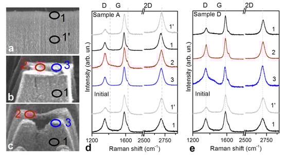 Points used to collect Raman spectra for initial MWCNT array (a), Sample A (b), and Sample D (c). Local Raman spectra of Sample A (d) and Sample D (e) compared with those of the initial array. Spectra are labeled by collection point explained in (a,b,c).