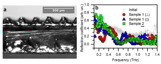 Previous investigations showed that CNTs have attractive intrinsic electromagnetic properties in the THz frequency range [50,51] and as a filler in dielectric matrices [52,53,54]. In particular, the properties of composites are strongly affected by the ordering of nanotubes [52,53] and surface functionalization [54]. The nano-structured arrays show a morphology-governed response in the optical region [15,16,21]. To test the suitability of the microstructured arrays of CNTs for THz applications, we fabricated two samples composed of engraved strips and columns (Samples 1 and 2) and measured their reflection coefficient in the frequency range of 0.1–1.4 THz. The patterning was performed at a laser power of 15 W to keep the engraved elements’ interior intact. Because engraved arrays of MWCNTs are fragile, the samples were uniformly covered by a thin epoxy layer (ca. 70–90 μm), as can be seen from the optical image in Figure 4a. The structural characterization results discussed above reveal strong oxidation of the MWCNTs’ surface after the treatment. Despite some deterioration in THz conductivity [54], the oxidized MWCNTs had an advantage over the initial ones due to improved wettability of the nanotube arrays with an epoxy resin, caused by the direct chemical interaction of MWCNTs with the matrix molecule through different oxygen-containing functional groups [55,56].