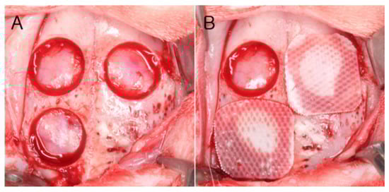 Surgical procedures were described in detail in a previous publication []. In brief, surgeries were performed under general anesthesia using inhalation of 2.5% isoflurane and intravenous injection of alfaxan (5 mg/kg). Before incision, surgical sites were disinfected with povidone iodine, and infiltration anesthesia was carried out using 2% lidocaine with 1:80,000 adrenaline. The incision was made along the midline of the calvarium from the frontal bone to the occipital bone, and a full-thickness flap was raised. Three circular defects were made with a trephine bur of 8 mm inner-diameter and each defect was treated as allocated by the study design. Flaps were repositioned and sutured with resorbable suture material (4-0 Vicryl, Ethicon, Somerville, NJ, USA). Sutures were removed one week after surgery. After two or eight weeks of healing, rabbits were sacrificed as allocated and specimens were obtained.