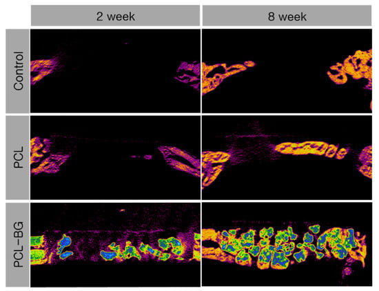 The results from the histomorphometric analysis are presented in Table 2. At two weeks, the PCL-BG group showed significantly greater TAA than the control group (p = 0.016). At eight weeks, the PCL-BG group exhibited greater TAA than the control and PCL groups (p = 0.008). Between two and eight weeks, among the PCL group, NBA was greater at eight weeks compared to two weeks (p = 0.043). In addition, among the PCL-BG group, NBA was greater at eight weeks compared to two weeks (p = 0.043).
