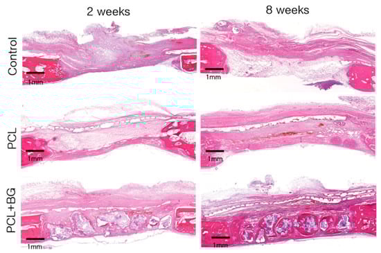 Histological view of each group at two and eight weeks. After eight weeks, the PCL/β-TCP membrane remained intact. Minimal inflammatory reaction was observed. The PCL-BG groups showed the greatest augmented area and new bone formation after eight weeks (H&E staining, scale bar = 1 mm).