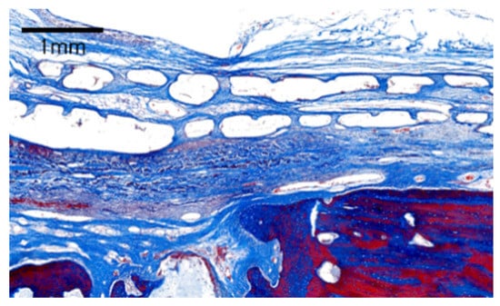 At eight weeks, the PCL/β-TCP membrane still maintained its shape and thickness. The membrane showed good integration with the surrounding tissues. Some parts of the membrane were resorbed and replaced by connective tissues and new bone. No inflammatory cells were observed. Compared to week 2, more mature lamellar bone could be observed. The structural stability of the PCL/β-TCP membrane was comparable to a previous study in dogs, in which the membrane retained its original shape after eight weeks [].