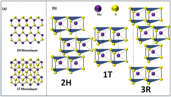 (a) Top view of 2H/1T MoS2 monolayer. (b) Polymorphic structures of MoS2 (2H is the hexagonal crystal form, 1T is the tetragonal crystal form, and 3R is the rhombohedral crystal form).